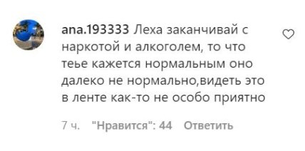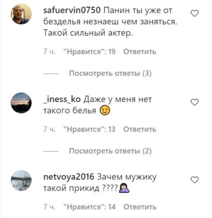 "Леха заканчивай с наркотой и алкоголем, то что тебе кажется нормальным оно далеко не нормально, видеть это в ленте как-то не особо приятно", "Зачем мужику такой прикид?", "Панин ты уже от безделья не знаешь, чем заняться. Такой сильный актер", "Скажите, пожалуйста, как к этому относится ваша дочь? Ей за вас не стыдно? Или она уже все видела?", "Какая мерзость невероятная" - пишут в комментариях.