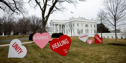 В преддверии Дня святого Валентина первая леди США Джилл Байден украсила Белый дом. 12 февраля на поляне возле президентской резиденции появились гигантские розовые сердца-валентинки с надписями-посланиями – "любовь", "сочувствие", "доброта", "семья", "единство", "благодарность", "мир", "сила".