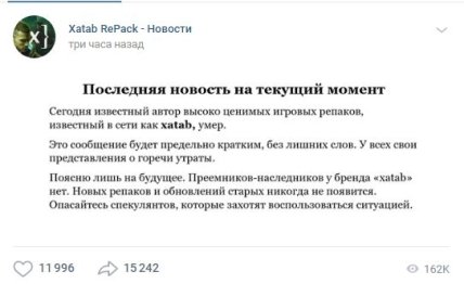 Широко известный в сети репакер xatab умер. Об этом сообщили в его сообществе в российской соцсети ВК.
