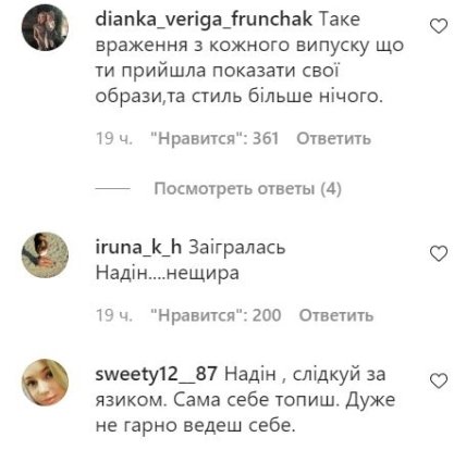 Для блогерши Надин Медведчук решение Михаила попрощаться с не было очень неожиданным. Холостяк не увидел, что она пришла на этот проект, чтобы найти свою любовь. Так, как Миша узнал, что Надин участвовала в проекте "Одруження наосліп", где по идеи тоже ищет любовь, да и признание блогерши о том, что 11 сезон "Холостяка" это ее 5 попытка попасть на проект, заставили бизнесмена думать о том, что ей таки нужен больше пиар, чем любовь.