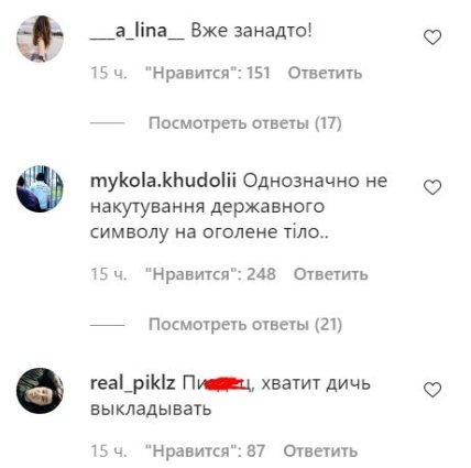 В комментариях не все поклонники поддержали свою любимицу, отметив, что подобные снимки патриотизма не прибавляют. Львовянка Ирина Коваленко на своей странице в Фейсбук посвятила этой теме даже отдельный пост.