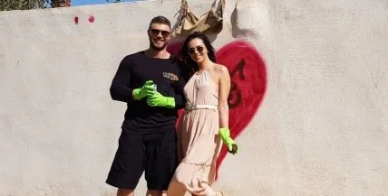 Пара разрисовала другу другу кошачьи мордочки, а потом с помощью баллончиков с красками - одну из массивных перегородок Египта. В итоге получился рисунок с влюбленными кошками на фоне огромного красного сердца.