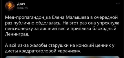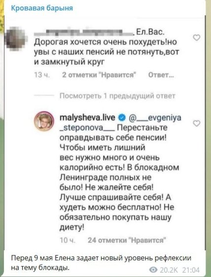 Об этом в комментарии к одному из постов Малышевой в Инстаграм, который она уже удалила, написала одна из "худеющих пенсионерок". Скрин как сообщения подписчицы, так и ответа теледоктора среди прочего опубликовала на своем телеграмм-канале Ксения Собчак.