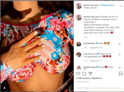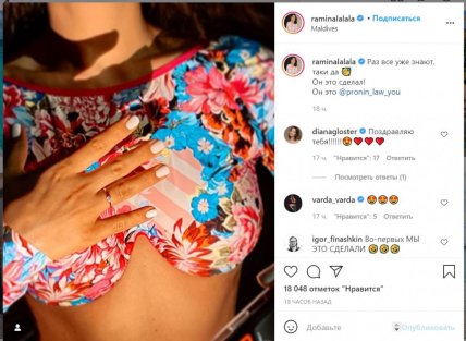 Радостной новостью Рамина поделилась на своей странице в Инстаграм, сразу после своего будущего мужа Евгения Пронина. Пара опубликовала одинаковые снимки, на которых видно лишь руку девушки, на которой красуется обручальное кольцо.