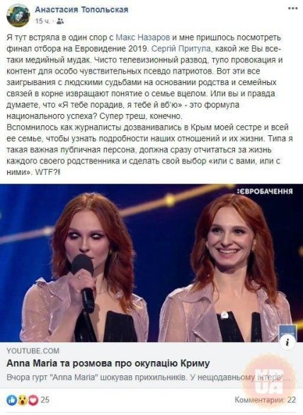 В октябре 2019 года во время нацотбора на "Евровидение 2019" близнецы из дуэта Anna Maria не смогли однозначно ответить на вопрос ведущего Сергея Притулы "Чей Крым?. Девушки расплакались прямо на сцене и в итоге заняли последнее место. Топольская на своей странице в Facebook назвала шоумена "медийным м*даком".