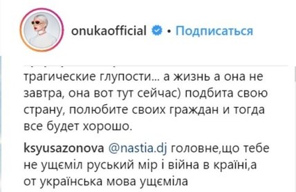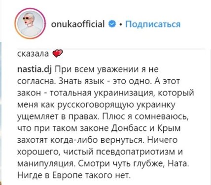 Весной 2019 года Анастасия назвала принятие закона "Об обеспечении функционирования украинского языка как государственного", принятого ВР 25 апреля "псевдопатриотизмом" и манипуляцией. Тогда ди-джей с головой ушла в интернет-войну на странице певицы ONUKA.