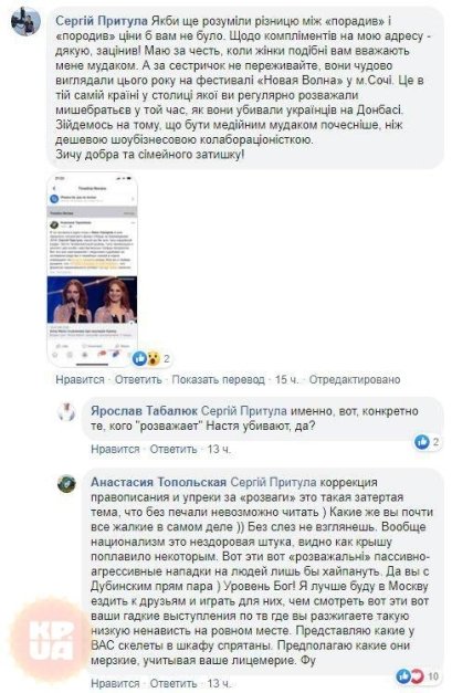 На что Притула назвал жену Лещенко "дешевой шоубизнесовой коллаборационисткой" и отметил, что ему "по**й" на оценку Топольской.