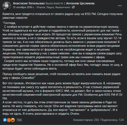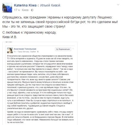 В декабре того же года скандально известный Илья Кива обложил матом Лещенко, когда Топольская резко прокомментировала реакцию украинцев на крушение Ту-154.