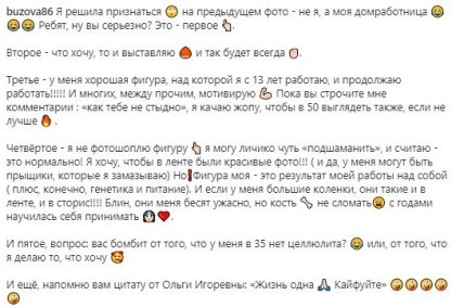 После негативной оценки Ольга решила ответить. В новом посте девушка отметила, что с 13 лет работает над своим телом и не фотошопит свои снимки, разве что "подшаманивает личико".