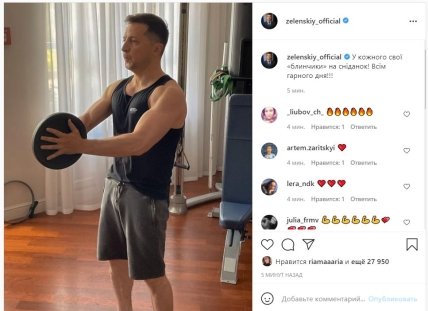 На своей официальной странице Инстаграм Зеленский опубликовал фото со своей тренировки. На снимке Владимир Олександрович предстал не в уже привычном для него костюме, а в спортивных шортах и майке. Президент делал упражнение с "блинчиками" от штанги.