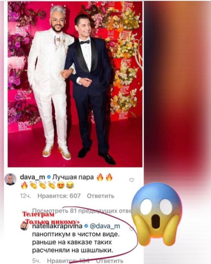 Отличилась в этом году и продюсер певицы Светланы Лободы - Нателла Крапивина, которая работает с артисткой больше 10 лет. После церемонии Крапивина подвела итоги "Муз-ТВ-2021": назвала шоу-бизнес "цирком уродов", а на днях оскорбила перфоманс Филиппа Киркорова и рэп-исполнителя Давида Манукяна (DAVA), который мужчины устроили на церемонии, имитировав нетрадиционную свадебную церемонию.