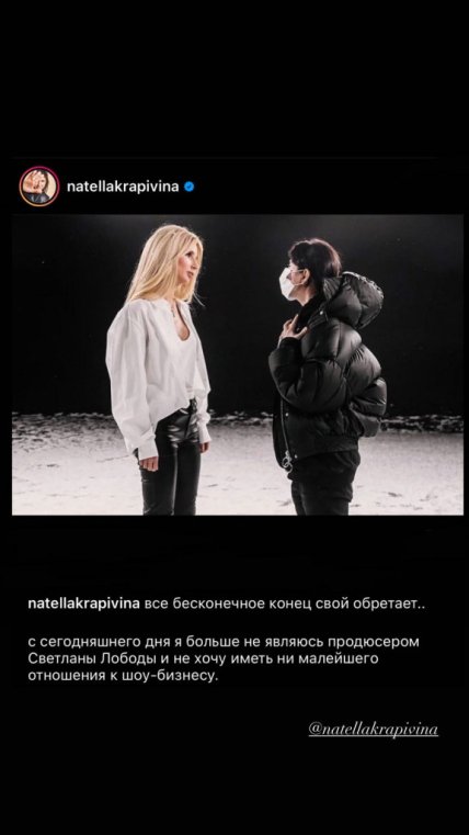 После обвинений артиста Крапивина заявила, что прекращает сотрудничество с Лободой и уходит из шоу-бизнеса. "Все бесконечное конец свой обретает... С сегодняшнего дня я больше не являюсь продюсером Светланы Лободы и не хочу иметь ни малейшего отношения к шоу-бизнесу", - написала продюсер в Инстаграме, после чего закрыла страницу. Лобода сделала репост в своем сториз.