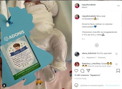 Стоит отметить, что в день, когда Катерина отправилась в роддом, она закрыла свою страничку в Инстаграм. Однако с теми, кто подписан на нее, Репяхова поделилась первыми кадрами из жизни своего первенца.