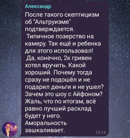 По словам женщины, парень подарил айфон ее дочери и снимал этот момент на видео, а когда трансляция закончилась, Александр попросил вернуть подарок и заявил, что это просто реквизит. Даже предложил 2000 грн, чтобы они никому про это не говорили.