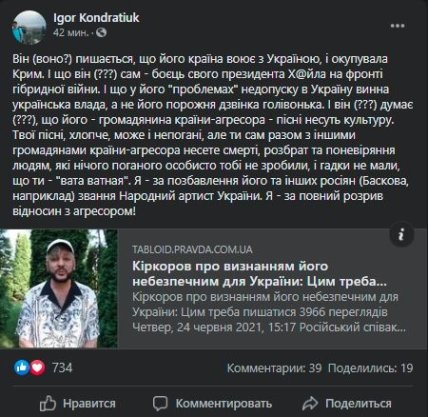 В свою очередь украинский музыкальный продюсер Игорь Кондратюк назвал российского певца "ватой ватной" у себя на странице в Facebook.