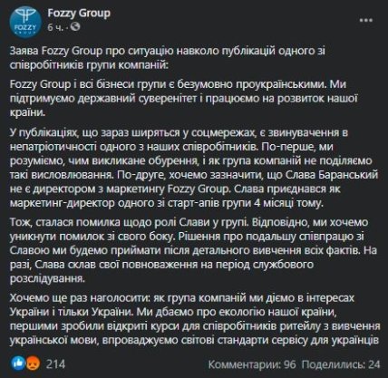 "Fozzy Group и все бизнесы группы является безусловно проукраинскими. Мы поддерживаем государственный суверенитет и работаем на развитие нашей страны. В публикациях, которые сейчас ходят в соцсетях, есть обвинения в непатриотичности одного из наших сотрудников. Мы понимаем, чем вызвано возмущение, и как группа компаний не разделяем такие высказывания. Соответственно, мы хотим избежать ошибок со своей стороны. Решение о дальнейшем сотрудничестве со Славой мы будем принимать после детального изучения всех фактов. На данный момент, Слава сложил свои полномочия на период служебного расследования", - сообщила пресс-служба Fozzy Group в соцсети.