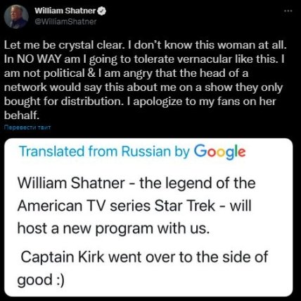 Уильям Шетнер извинился за анонс своей программы на российском канале RT.