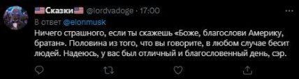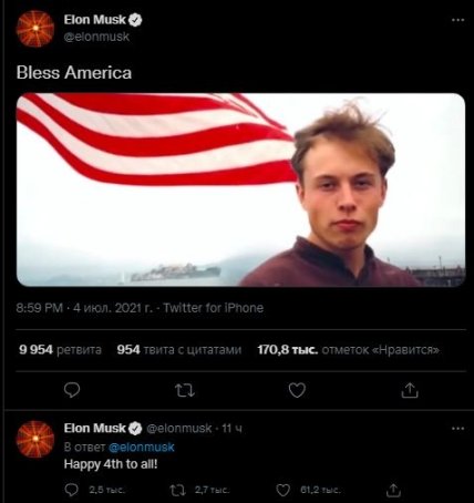 На Илона ополчились в Twitter, и все из-за того, что он поздравил американцев с Днем независимости США 4 июля, вписав название известной патриотической песни God Bless America ("Боже, благослови Америку"), но без первого слова.