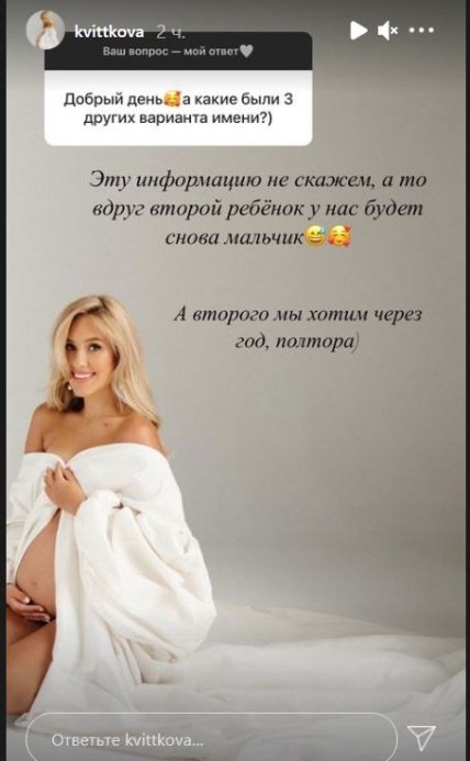 Пара еще не успела насытиться родительством, как Даша и Никита уже планируют второго ребенка. В сторис Квиткова не призналась, какие имена еще они рассматривали, ведь вдруг второй ребенок, которого они планируют через год\полтора, тоже будет мальчик.