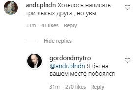 Фото уже породило много шуточных комментариев, на которые Гордон отвечал не менее забавно. Также припомнили его недавний ответ на угрозы со стороны националиста "ты мне не попадайся на глаза, я тебе кадык вырву, с**а". Напомним, что эта фраза стала мемом в сети, на который даже сняли клип.