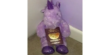 Эмили Харрис, из Кумбрана, Уэльс, взяла игрушечный паспорт, который она сделала для своего единорога по имени Лили, перед поездкой на недельный отдых в Турцию.