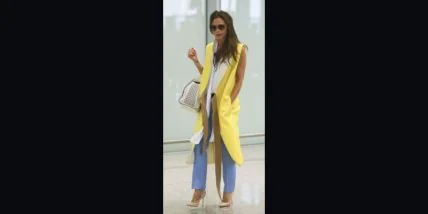 Из самолета Виктория вышла, одетая в голубые свободные брюки и желтый легкий жакет. Украинские журналисты подметили сходство ее лука с украинским флагом. Вот только бывшей мировой модели пришлось бы пройтись на руках для достижения полного сходства, ведь желтый должен быть снизу, а голубой - сверху.