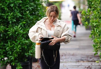 Американскую актрису и певицу, звезду сериала "Лиззи Магуайер" Хилари Дафф сфотографировали на улице в Лос-Анджелесе, Калифорния. 35-летняя Хилари попала на камеру в повседневном виде.