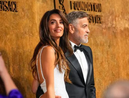 Амаль, которая младше мужа на 17 лет, появилась в сопровождении Джорджа в белом облегающим платье модного бренда Versace с длинным шлейфом до пола. Свой элегантный образ британский юрист ливанского происхождения дополнила серьгами с бриллиантами и белым клатчем.