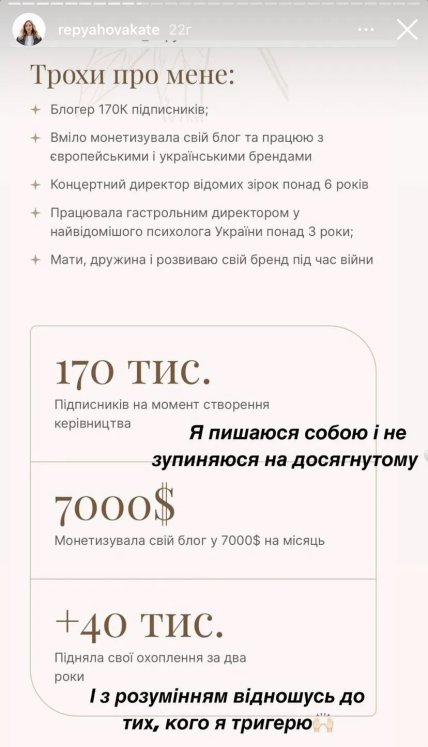 По словам Кати, она очень гордится собой, так как в ее блоге уже 170 тысяч подписчиков, и она монетизирует свой блог в 7 тыс долларов в месяц. Также Репяхова рассказала, что уже 6 лет является концертным директором известных звезд, работает с украинскими и заграничными брендами, а также развивает свой бренд во время войны.